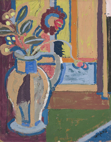 KatNr 240 Albert Wigand "Blumen in blau-beiger Vase gegen grün und braun". Um 1961.