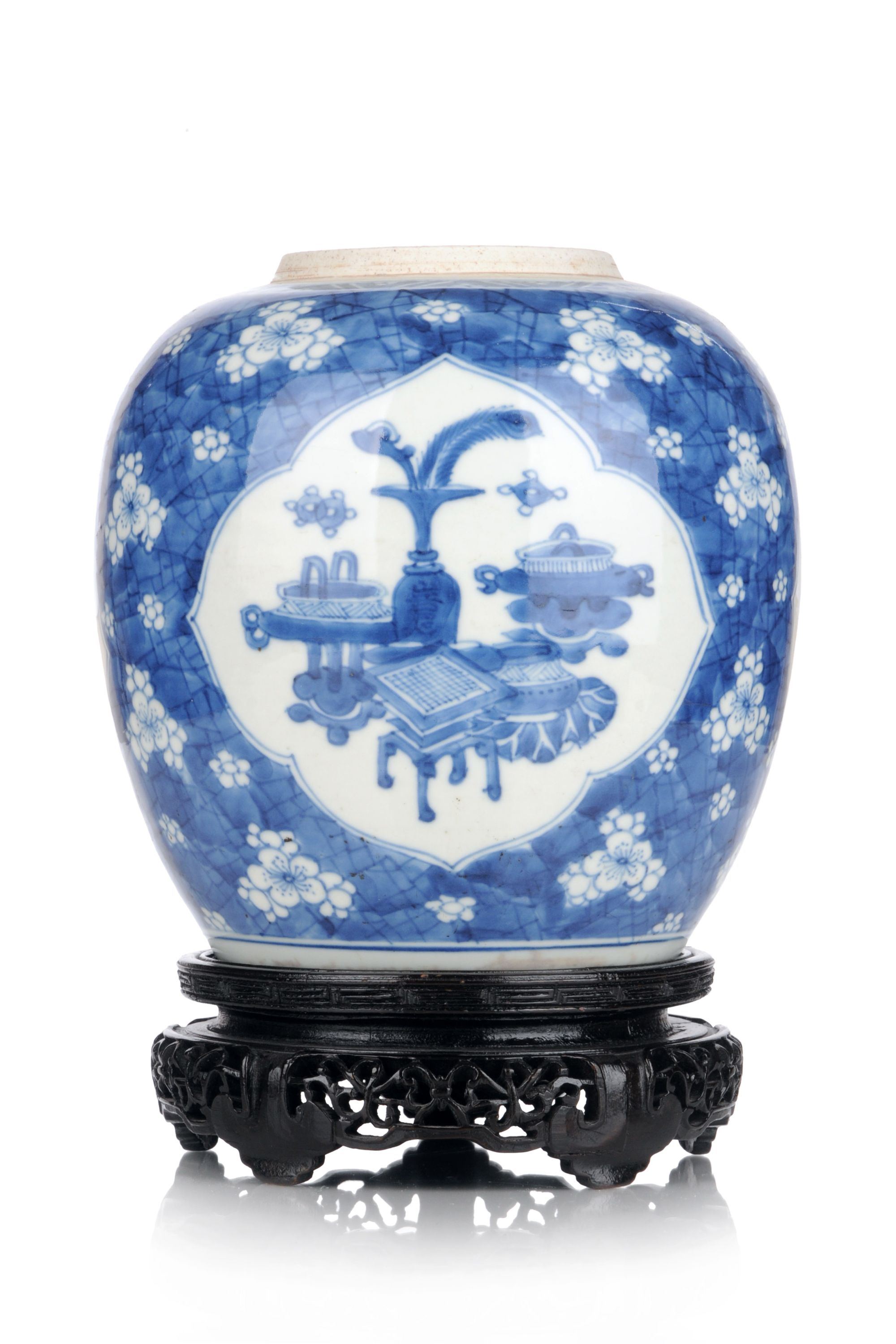 Porzellan, glasiert und in Unterglasurblau staffiert. Balusterform mit einschwingender Schulter. Wandung mit drei passig geschweiften Reserven, darin die Darstellung verschiedener Gefäßformen. In den Zwischenräumen Pflaumenblütendekor über "geborstenem Eis". Unterseits blauer Doppelring. Ungemarkt. Durchbrochen geschnitzter, runder Sockel, dunkel lackiert.