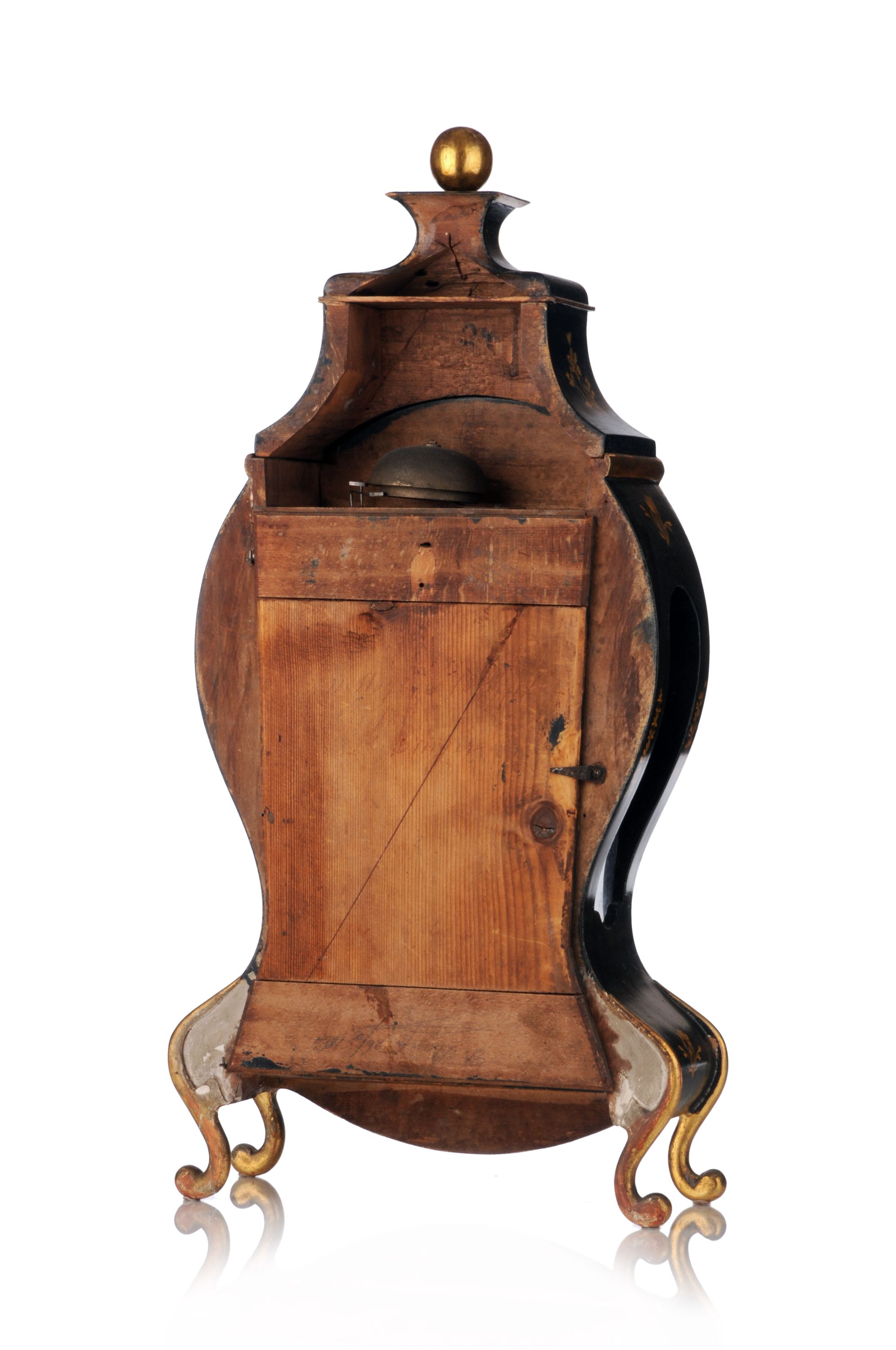 Holz, geschnitzt, zusammengesetzt und ebonisiert sowie polimentvergoldet. Zweiteiliger Aufbau, bestehend aus Uhrengehäuse und Aufsatzbekrönung. Ballonförmiges, bikonkav geschwungenes Gehäuse auf vier Volutenfüßchen. Zu beiden Seiten je eine verglaste Öffnung, verso eine eingehängte, schauseitig schwarz und goldfarben gefasste Gehäusetür. Die Front mit einer über Zifferblatt und Pendelöffnung laufenden, geschwungenen Tür. Der Giebelaufsatz konkav prismatisch geschweift und mit einer Kugelbekrönung. Die Schauseite der Pendule mit Blütenzweigen, Kanten- und Kugeldekor polimentvergoldet. Emailliertes Zifferblatt mit Sonnenzeigern. Römische, schwarz gefasste Stundenziffern, oberhalb arabische Minutenziffern, unterhalb Datumsziffern, zwei Aufzugsöffnungen. Originales Achttage-Rechenschlagwerk mit Clementhemmung, Dreivierteldoppelschlag auf zwei Glocken, Stundenschlag auf eine Glocke. Flaches Rundpendel an Fadenschlaufe. Werk ungemarkt. Ergänzter Schlüssel vorhanden. Verso auf dem Gehäusedeckel in Blei über Kopf bezeichnet "F. Sta [...]" und datiert "26/2 1864" sowie restauratorisch in Blei bezeichnet "nettoyé le 13. Sept. 1868".