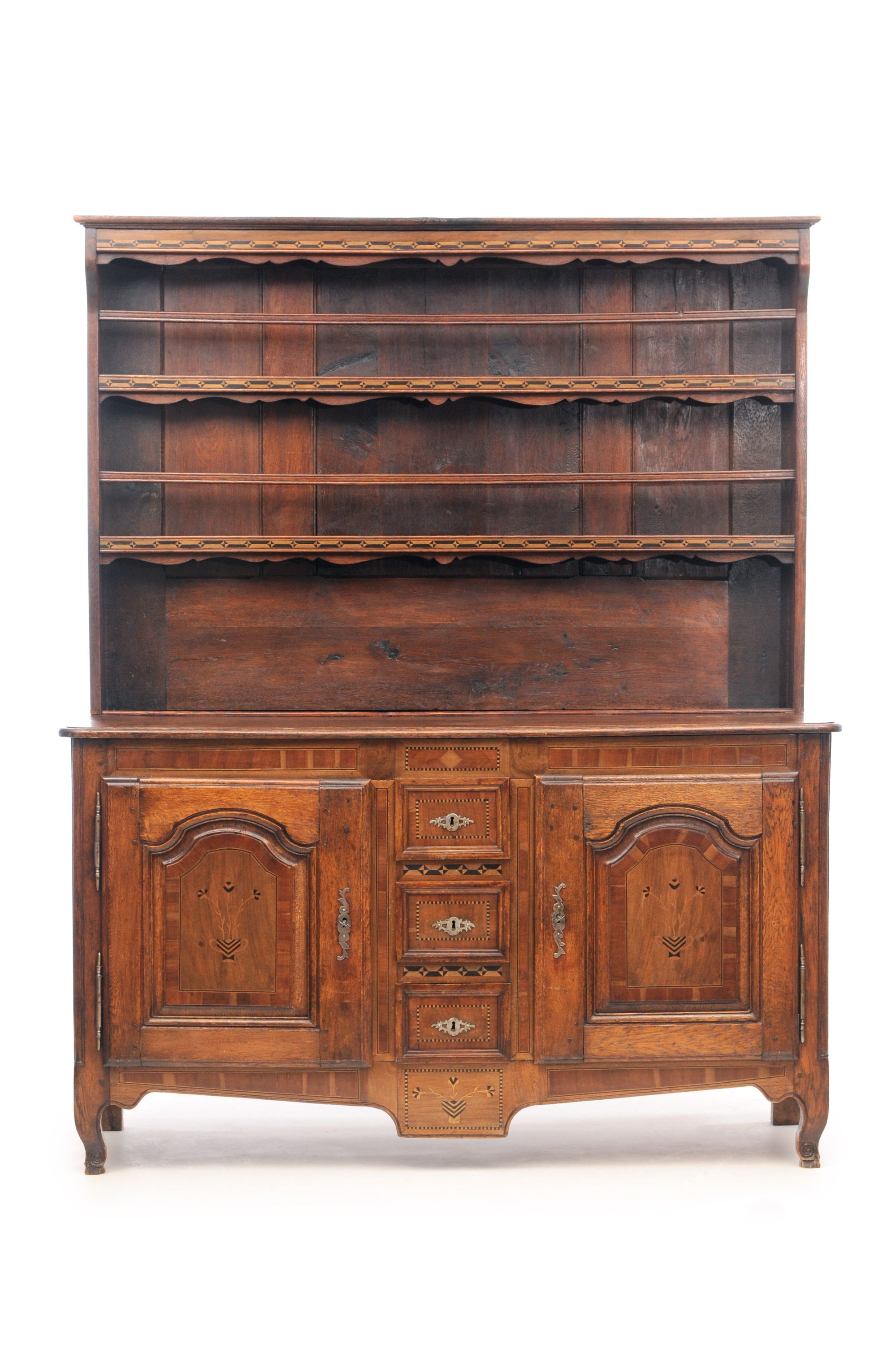 Eiche, dunkelbraun lackpoliert, partiell nussbaumfurniert und ebonisiert. Querrechteckiger Aufsatz mit zwei geschweift abschließenden Tellerborden mit Halterung und profiliertem, flachen Gesims und unterhalb geschweifter Leiste. Der querrechteckige Unterbau über vier kurzen, s-förmig geschwungenen Füßen. Zentral drei, von zwei Türen flankierte Schübe. Die Türen mit hochrechteckigen Füllungen und geschweiften Abschlüssen, Füllungen und Korpuszarge mit einem intarsierten Floraldekor. Die Schübe und Tellerborden mittels intarsiertem Band- sowie Zahnfriesdekor akzentuiert. Eintourige Kastenschlösser. Schlüssel vorhanden.