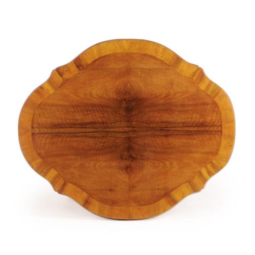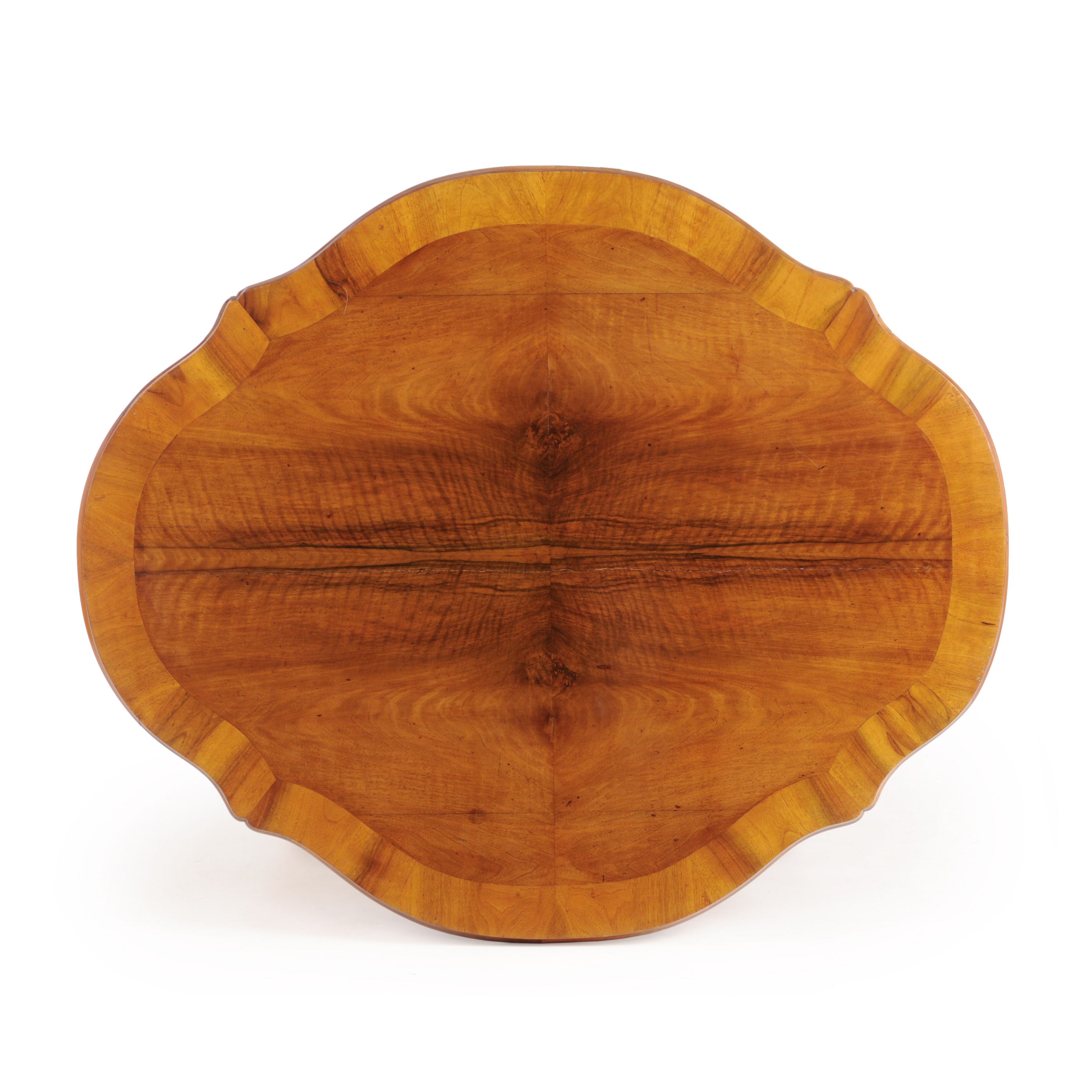Laubholz, Nussbaum furniert und lackpoliert. Passig geschweifte Tischplatte über vier S-förmig geschwungenen und profilierten Beinen, die Zarge ebenfalls geschweift und mittels einer Wulst akzentuiert. Das gefladerte Furnier der Tischplatte vierfach gefeldert sowie gespiegelt und mittels eines umrahmenden Bandes mit gestreifter Textur akzentuiert. Unterseits der Tischplatte in Blau mit Farbstift beschriftet (wohl Name des Auftraggebers) sowie unterseits auf der Zarge mit einem Brandstempel "O" im Rund.