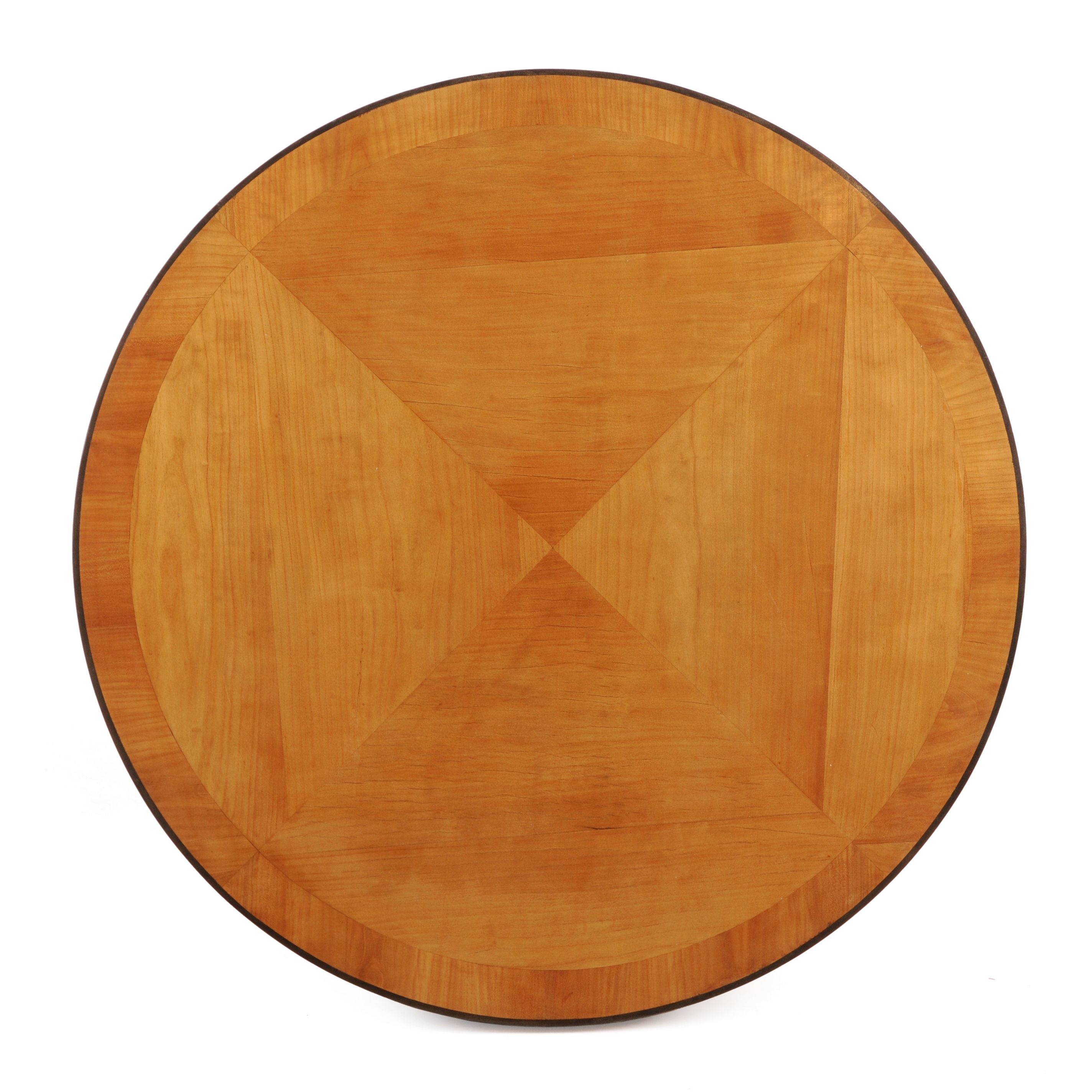 Holz, Nussbaum furniert und partiell ebonisiert. Drei leicht gebogte Vierkantbeine mit einem zwischengesetzten, vierseitig eingeschwungenen Ablagefach. Die von einer Trommelzarge getragene, runde Tischplatte vierfach gefeldert. Die Kante der Tischplatte ebonisiert. Auf der Trommelzarge ein schwarz umrahmtes, florales intarsiertes Dekor. Unterseits in Blau mit Farbstift beschriftet (wohl Name des Auftraggebers).