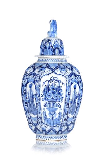 Fayence, heller Scherben, weiß glasiert, in Unterglasurblau staffiert. Balustervase mit achtfach facettiertem, geriffelten Korpus. Eingezogener Stand und Mündung. Glockendeckel mit Fo-Hund als Handhabe. Mit stilisiertem, asiatisch anmutenden Pflanzendekor. Am Boden Pinselmarke "O/A" und weitere Zeichen.