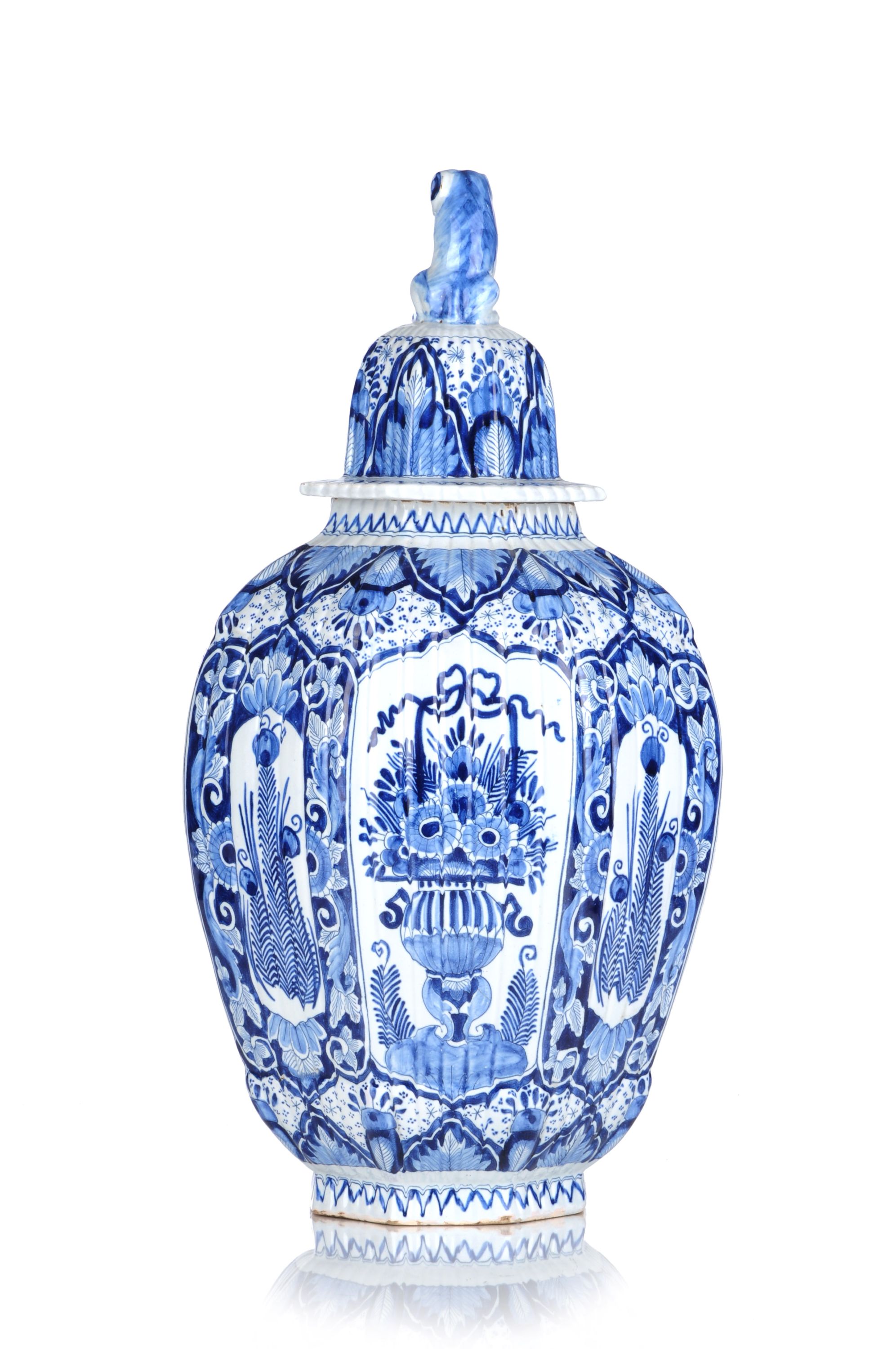1105 Große Deckelvase mit Fo-Hund im Delfter Stil. Wohl 19. Jh.
