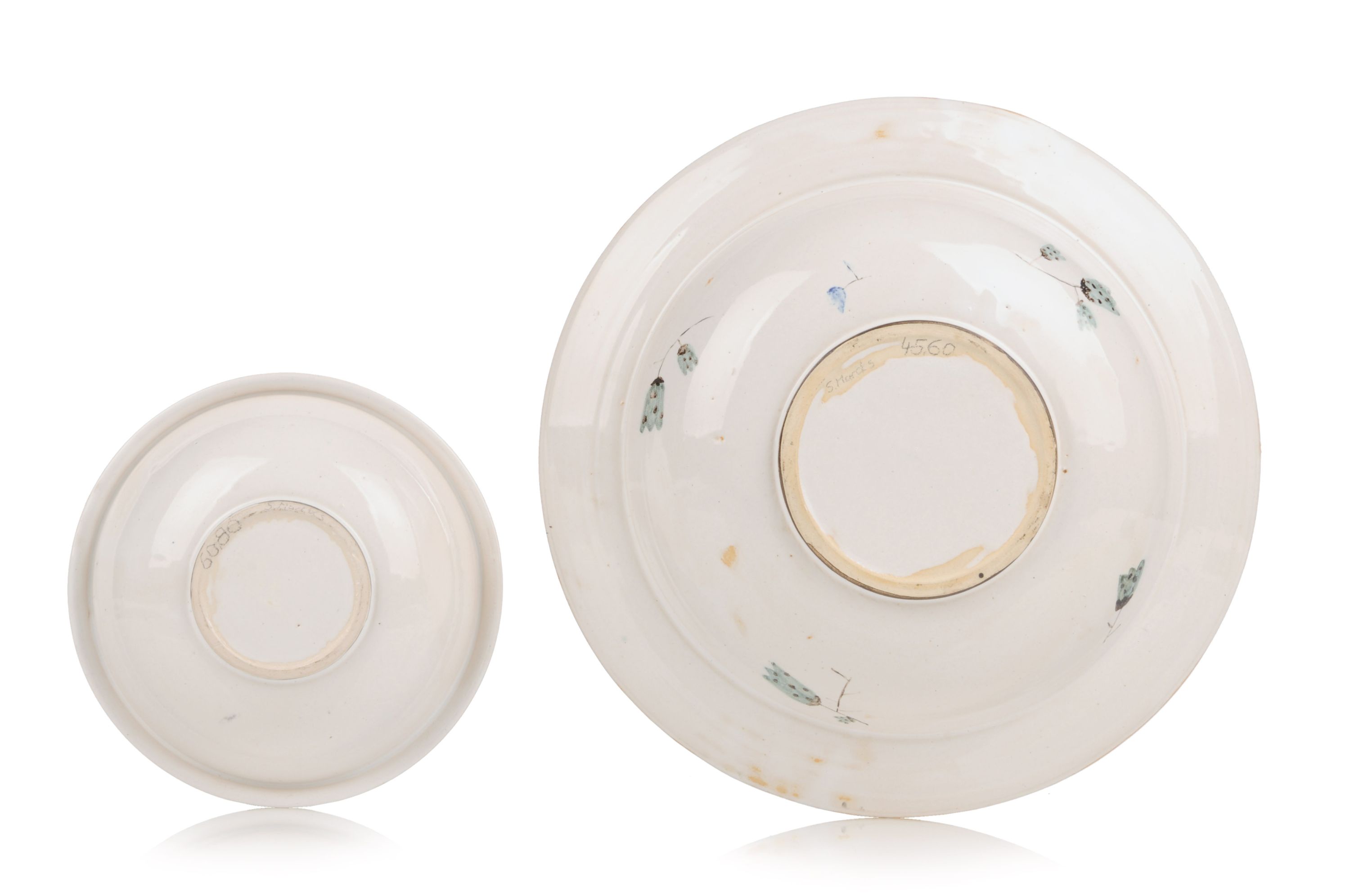 Keramiken, heller Scherben, bemalt und glasiert. Große Schale: runde, tief gemuldete Form mit leicht ausgestellter Fahne. Spiegel, Wandung und Fahne mit einer Landschaft mit drei Figuren farbig staffiert. Kleine Schale: runde, tief gemuldete Form mit nach außen gesenkter Fahne. Spiegel mit floral gefülltem Quadrat und einzelnen stilisierten Pflanzen, Fahne mit stilisierten Blättern staffiert. Jeweils verso mit Blei von fremder Hand künstlerbezeichnet.