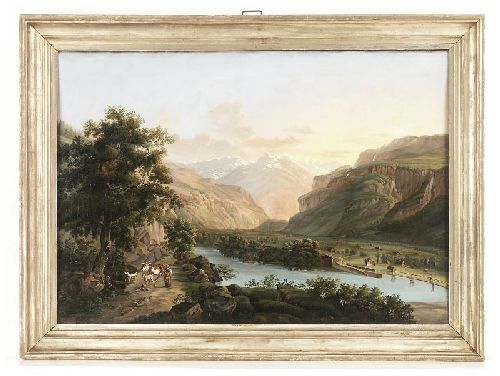 012 Unbekannter Maler "Bergige Flußlandschaft mit Weidevieh und Hirtin". Ohne Jahr.