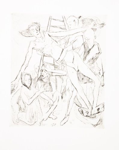 Kaltnadelradierung auf Bütten. Unsigniert. Verso mit dem Nachlaßstempel versehen und vom Sohn des Künstlers Peter Beckmann authorisiert sowie typographisch bezeichnet. Nummeriert "91". In "Apokalypse. Die Offenbarung Sankt Johannis in der Übertragung von Martin Luther". Leinenbezogene Kassette mit der Buchausgabe mit 27 reproduzierten Farblithographien von Max Beckmann. Halbpergamentband. Vorzugsausgabe, Reclam Verlag, Leipzig, 1989. Eines von 250 Exemplaren der Vorzugsausgabe.