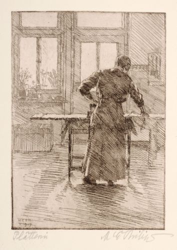 Radierungen auf verschiedenen Papieren. "Plätterin" und "Mann mit Hut" in der Platte monogrammiert "MEPH" und datiert. Alle drei unterhalb der Darstellung in Blei signiert "M. E. Philipp". "L… Buhmeister" zudem recto und verso (dort von fremder Hand) teils unleserlich in Blei betitelt. "Plätterin" in Blei betitelt. "Mann mit Hut" in Blei nummeriert "2/15" sowie verso von fremder Hand bezeichnet "Kammersänger Ermold".