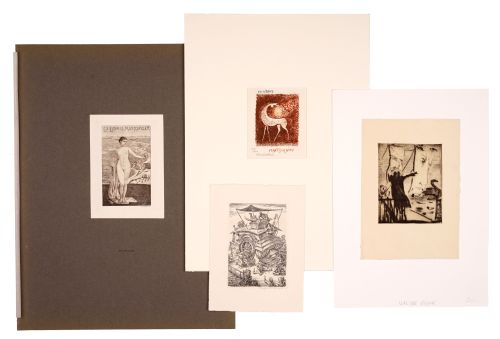 b) Sammlung von ca. 50 Exlibris, Klein- und Gebrauchsgrafiken. erotische Motive: Elfeide Weidenhaus (15), Rudolf Koch, Braunschweig (3), Joachim John, Walter Rehn, Lothar Sell (2), Claus Weidensdorfer, Siegfried Ratzlaff (3), Erich Kuithan, Italo Zetti, Rolf Kuhrt, Richard Flockenhaus, Josef Weisz. Vereinzelt in Blei signiert, U.a. mit erotischen Motiven. Teils auf Untersatz montiert.