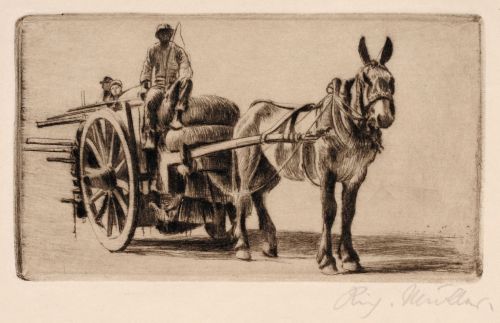 Radierungen in Schwarzbraun mit Plattenton auf feinem, wolkigen Papier. Unterhalb der Platte in Blei signiert "Rich. Müller" u.re. "Eine Anfrage" mittig in der Platte ligiert monogrammiert "RM" und datiert. An den o. Ecken im Passepartout montiert. "Italienisches Fuhrwerk" auf Untersatz im Passepartout montiert. Untersatz von fremder Hand in Blei bezeichnet.