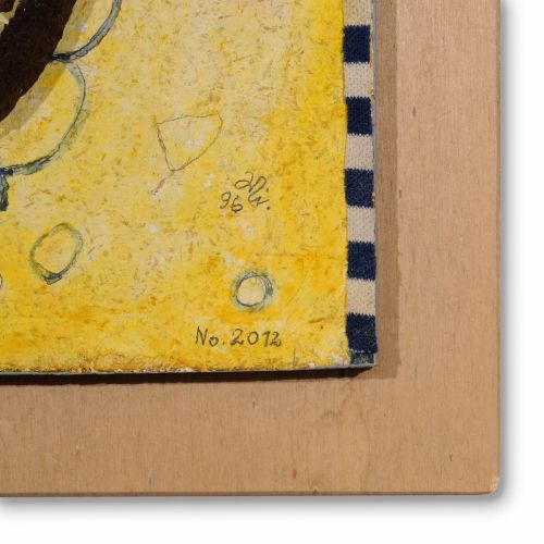 Assemblage (rostige Eisenteile, Textil, Öl und Bleistiftzeichnung) auf Pressspanplatte, auf Sperrholzplatte montiert. In Blei u.re. undeutlich monogrammiert, datiert sowie am u. Rand betitelt und nummeriert "No. 2012". Auf der Sperrholzplatte verso nochmals nummeriert " No. 2021" sowie betitelt.
