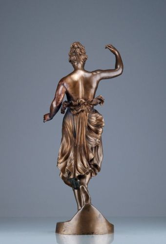 Während die Kopfbehandlung noch an die statischen antiken Vorlagen gemahnt, zeichnet sich die Bronze durch die wundervoll eingefangene Dynamik und Kraft aus, die der jungfräulichen Gestalt innewohnt. Die zarte Kräuselung des Tuches greift die Bewegung der Figur auf, gleichzeitig schmiegt es sich an den Körper und scheint beinahe durchsichtig.