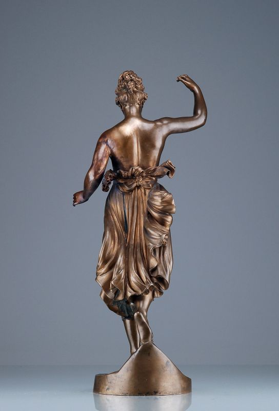 Bronze, braun patiniert. Auf einem Natursockel schreitet die nur mit einem um die Hüften geschlungenen Tuch Bekleidete voran, den rechten Arm nach oben gestreckt. Auf dem Sockel rechts signiert "A. Röhrich Roma".