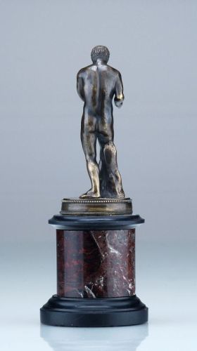 Bronze, dunkel patiniert. Vollplastische Figur eines jungen Mannes in Schrittstellung auf einem zylindrischen Sockel. Bronze auf hohen, dreiteiligen Sockel aus Serpentin montiert.