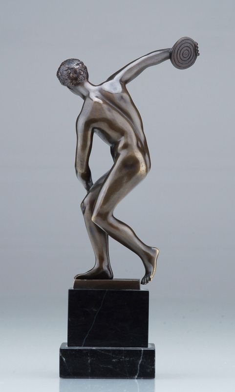 Bronze, schwarzbraun patiniert. Nach dem antiken Vorbild des Diskobos von Myron, 460 - 450 v. Chr. Die Scham ist durch ein Blatt bedeckt. Auf der Plinthe signiert "Richard W. Lange". Auf einem Serpentinsockel montiert.