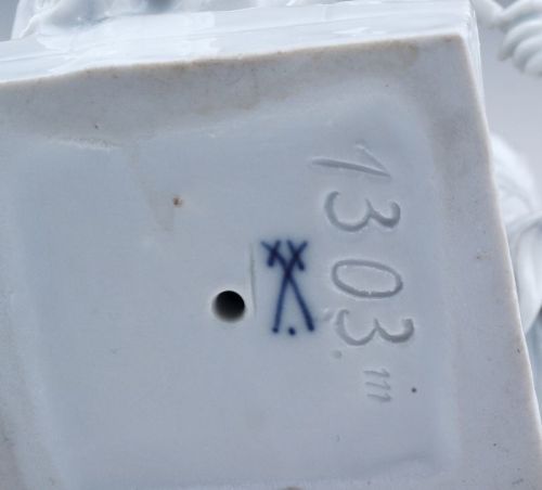 Porzellan, glasiert. Auf einem Baumstumpf sitzende Köchin, einen gespickten Hasen mit der rechten Hand emporhebend, in der linken ein Kochmesser haltend. Auf dem Schoß ein Brett mit Speck und Spicknadel. Quadratischer Backsteinsockel. Am Boden Schwertermarke in Unterglasurblau, daneben ein vertikaler Schleifstrich für Weißware. Geritzte Formnummer "1303." sowie "111".