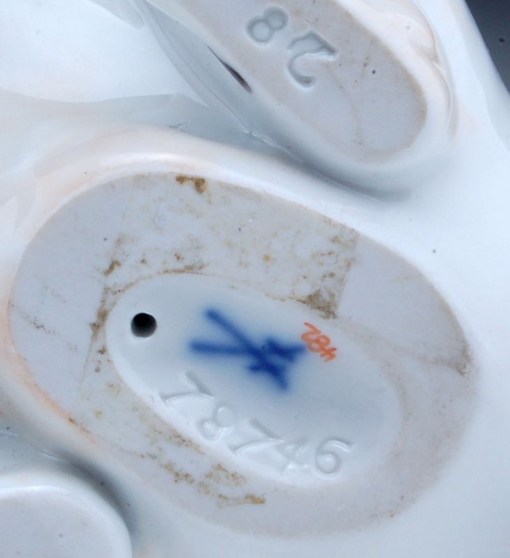 Porzellan, glasiert, in polychromer Aufglasurmalerei staffiert. Am Boden Schwertermarke in Unterglasurblau, geprägte Modellnummer "78746", Bossierer- und Jahreszeichen (undeutlich), Malernummer in Eisenrot.