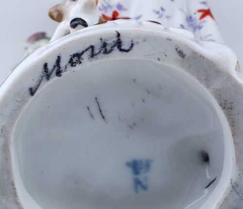 Porzellan, glasiert, in polychromen Aufglasurfarben staffiert. Stehende, an einen Baumstumpf gelehnte Flötenspielerin auf Rocaillesockel, dicht neben ihr ein liegendes Lamm. Marke in Unterglasurblau (undeutlich).