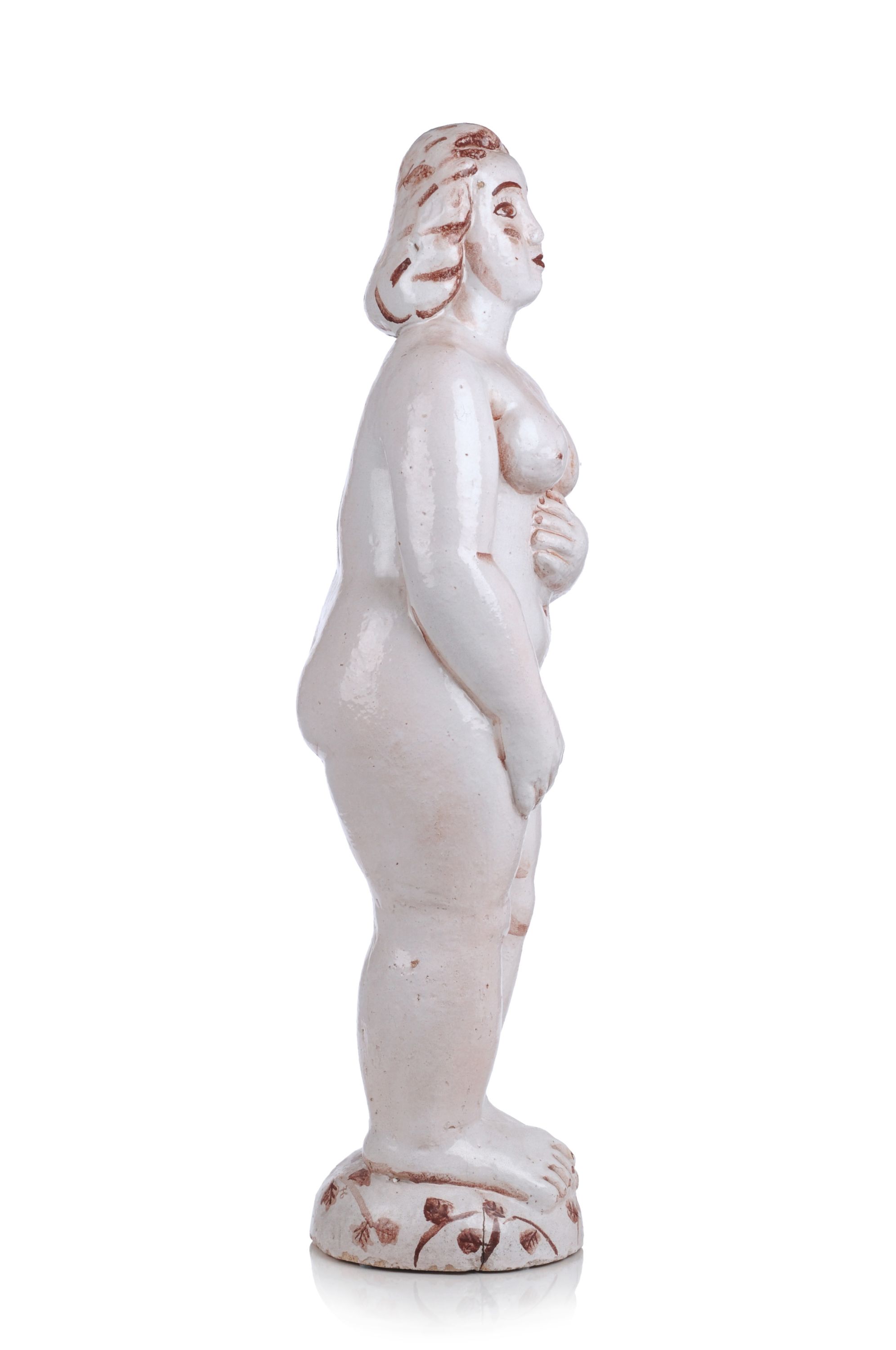 Großer Brandriss im hinteren Sockelbereich, kleinere im Bereich der Beine. Die Glasur partiell mit Krakelee, mehrere Glasurrisse und -unebenheiten, besonders im Bereich der re. Brust und des re. Oberarms. Mehrer kleine Einschlüsse und Fehlstellen, aus dem Werkprozess stammend. Herstellungsbedingtes Loch im Bereich des Kopfes. Am re. Bein, verso im Schulter- und Hüftbereich sowie am Sockel Abplatzungen bzw. Bestoßungen.