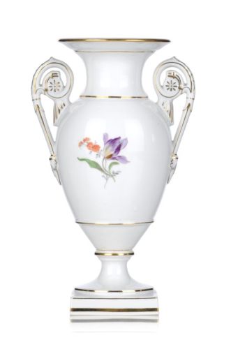 Porzellan, glasiert, montiert und in polychromen Aufglasurfarben staffiert, die Ränder mit Goldfaden. Balusterform mit ausladender Mündung über rundem, abgesetzten Standfuß und quadratischem Sockel. Seitlich an der Wandung zwei reliefierte Volutenhenkel. Auf der Wandung schauseitig ein Blütenbukett, verso ein Blütenzweig. Unterseits die Schwertermarke in Unterglasurblau, die geritzte Modellnummer sowie die geritzte Drehernummer mit Jahreszeichen.