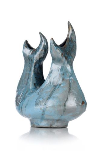 Keramik, hellgrauer Scherben, in Raku-Technik changierend taubenblau über braun glasiert. Schiffsbauchförmiger Korpus über Rundstand, in zwei dreiseitige Schäfte übergehend, die Mündungen mondsichelförmig. Unterseits geritzt ligiert monogrammiert und datiert.