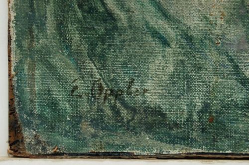 Öl auf Leinwand, auf Malpappe kaschiert. In Schwarz signiert u.li. "E.Oppler". O.re. von fremder Hand bezeichnet "39". Verso mit Studie eines Herrenportraits. In schmaler weißer Holzleiste in ebonisiertem Hohlkehlenrahmen gefaßt. Malschicht mit unscheinbaren Retuschen, unregelmäßige Randbereiche der Leinwand.