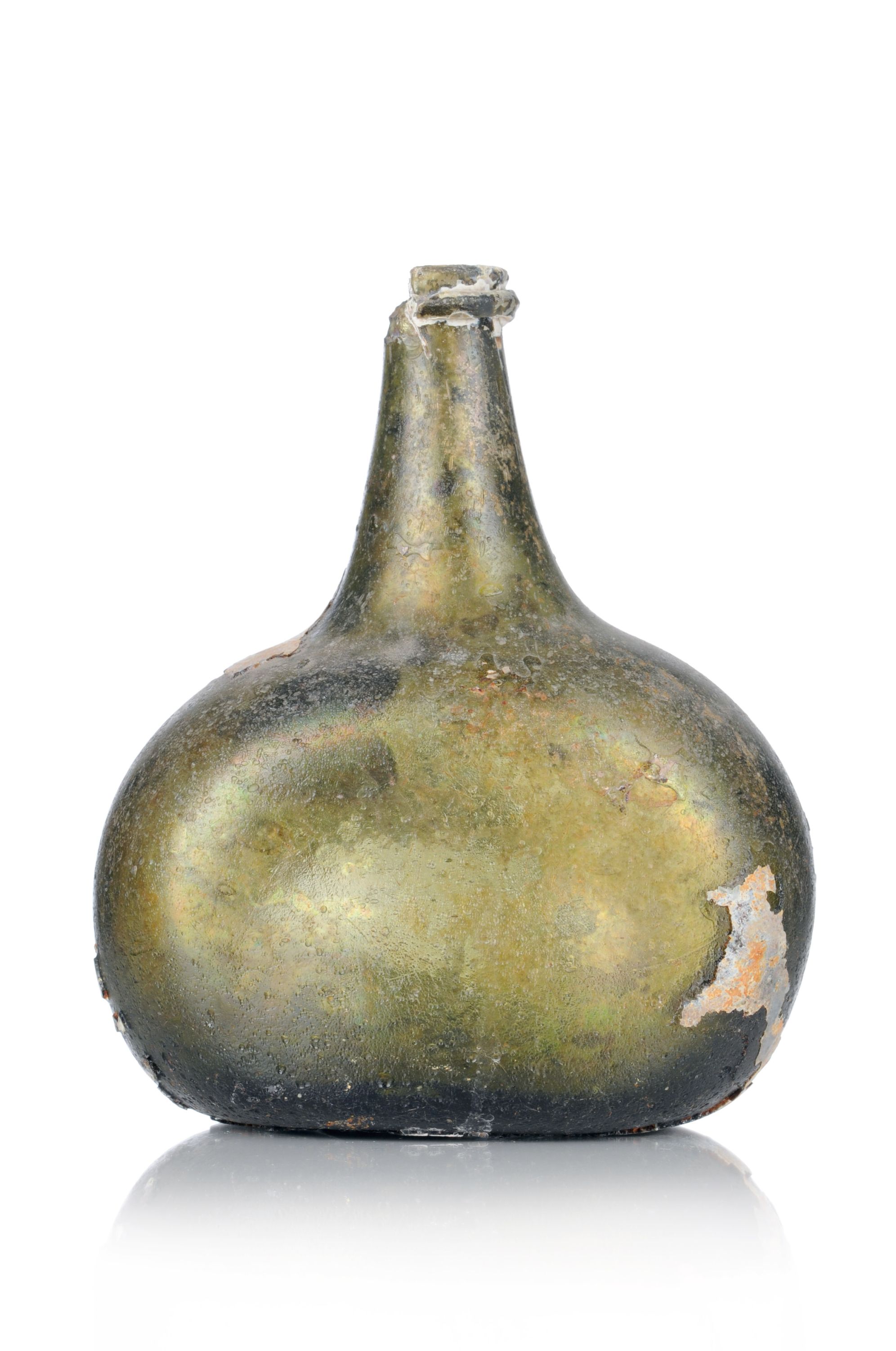 Irisierend grün getöntes Glas. Beidseitig abgeflachter, gebauchter Korpus mit verjüngtem Hals, die Mündung mit aufgelegtem Faden, der Boden mit eingestochenem Abriss. Bodenfund.