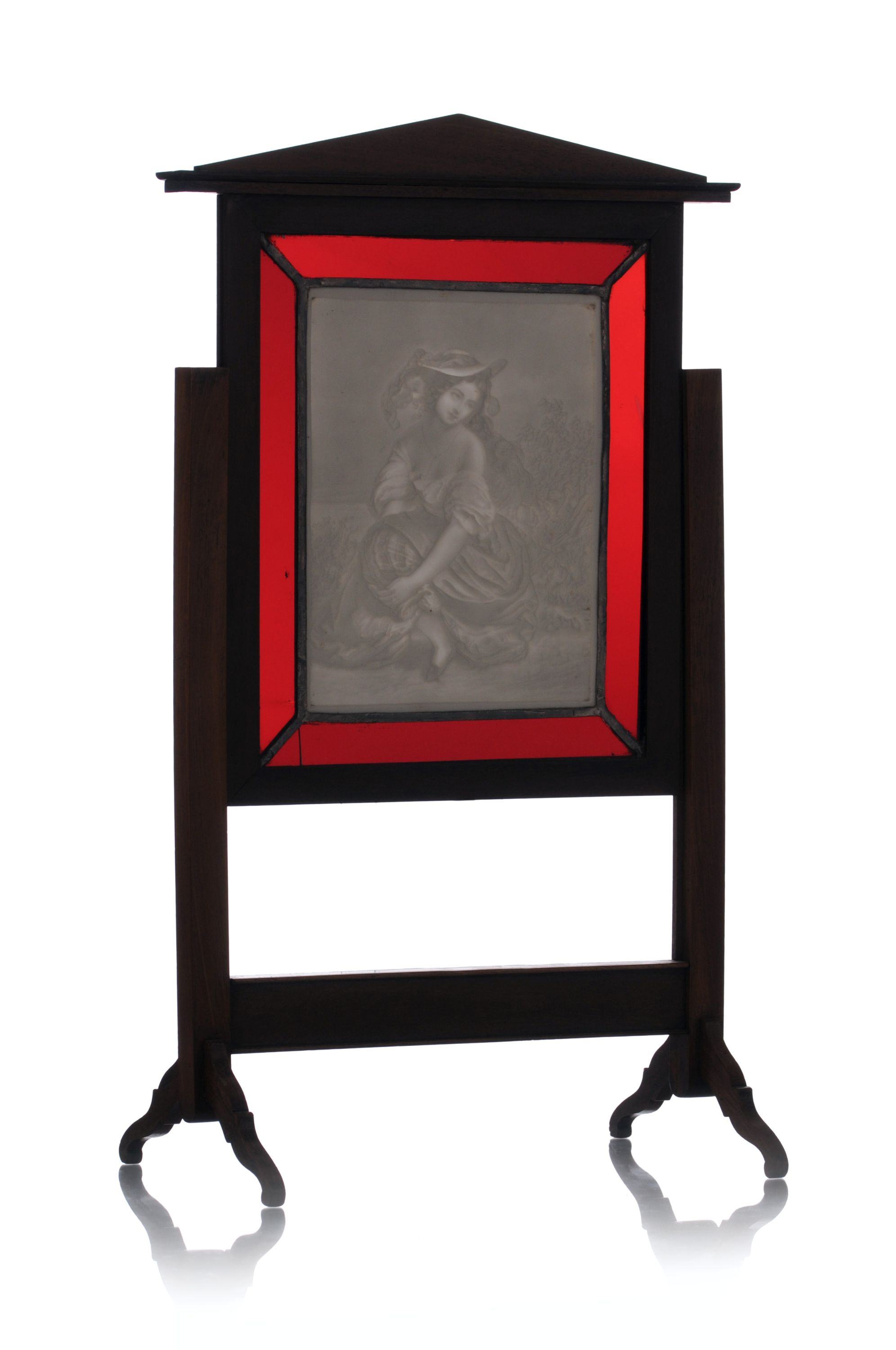 Biskuitporzellan, reliefiert gearbeitet, Holz, lackpoliert sowie tiefrot getöntes Glas. Flache, hochrechteckige Tafel mit der Genre-Darstellung einer jungen Dame. Verso mit der Prägeziffer "148". Ohne Manufakturmarke. Kathedralglasrahmung in einem zweiteiligen, giebelbekrönten Lithophanieständer.