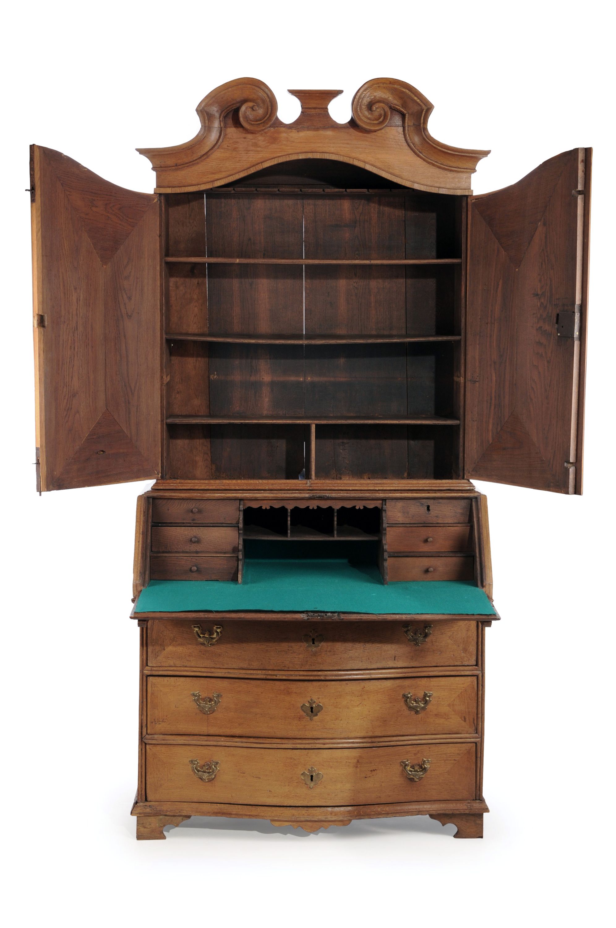 Eiche, Messing, gegossen und poliert. Dreiteiliger, aus Unterschrank, Mittelkorpus und Aufsatz zusammengesetzter, hochrechteckiger Aufbau mit abgeschrägte Seitenkanten auf gesägten Füßen. Der Unterbau leicht geschweift und dreischübig. Das Mittelteil mit ausklappbarer Schreibplatte. Das Eingerichte zentral mit drei Fächern, flankiert von jeweils drei versetzt angeordneten Schüben mit originalen, eintourigen Schlössern. Die Schreibplatte mit grünem Filz belegt. Der Aufsatz mit zwei, jeweils vierfach gefelderten Türen, gesprengter Giebel, originale Zapfenbänder. Eine Tür als Bedarfstür mit Stulpriegeln. Das Eingerichte mit drei Fachböden und einem Glashalter. Die Schübe mit jeweils zwei Handhaben, Schübe, Schreibklappe und Türen mit geschweiften Messingeschlägen, Schlüssel vorhanden.