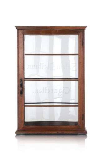 Holz, lackpoliert und farbloses Glas sowie Gelbmetall. Vierseitig verglaster und schauseitig geschweifter Korpus. Das Eingerichte mit drei holzumrahmten Fachböden. Die Tür für den Tresenverkauf verso und mit Griff. Akzentuierung des Gehäuses mittels Zierbeschlägen. Die Verglasung schauseitig mit der mattgeätzten Werbeaufschrift "Salem Aleikum Cigaretten".