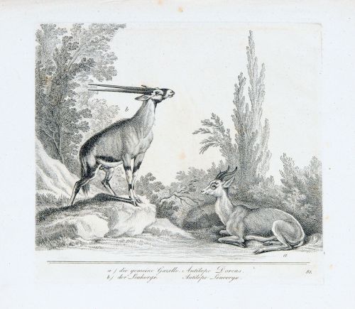 Kupferstiche auf "Thurneisen" -Bütten. Jeweils in der Platte unterhalb der Darstellung in Deutsch und Latein typographisch betitelt "Capra Hircus", "Tragus Arabicus", "Antilope Dorcas, Antilope Leucoryx", "Antilope Dorcas" und "Antilope Strepsiceros" sowie nummeriert "72", "74", "81", "82" und "83" u.re. Jeweils im Passepartout.