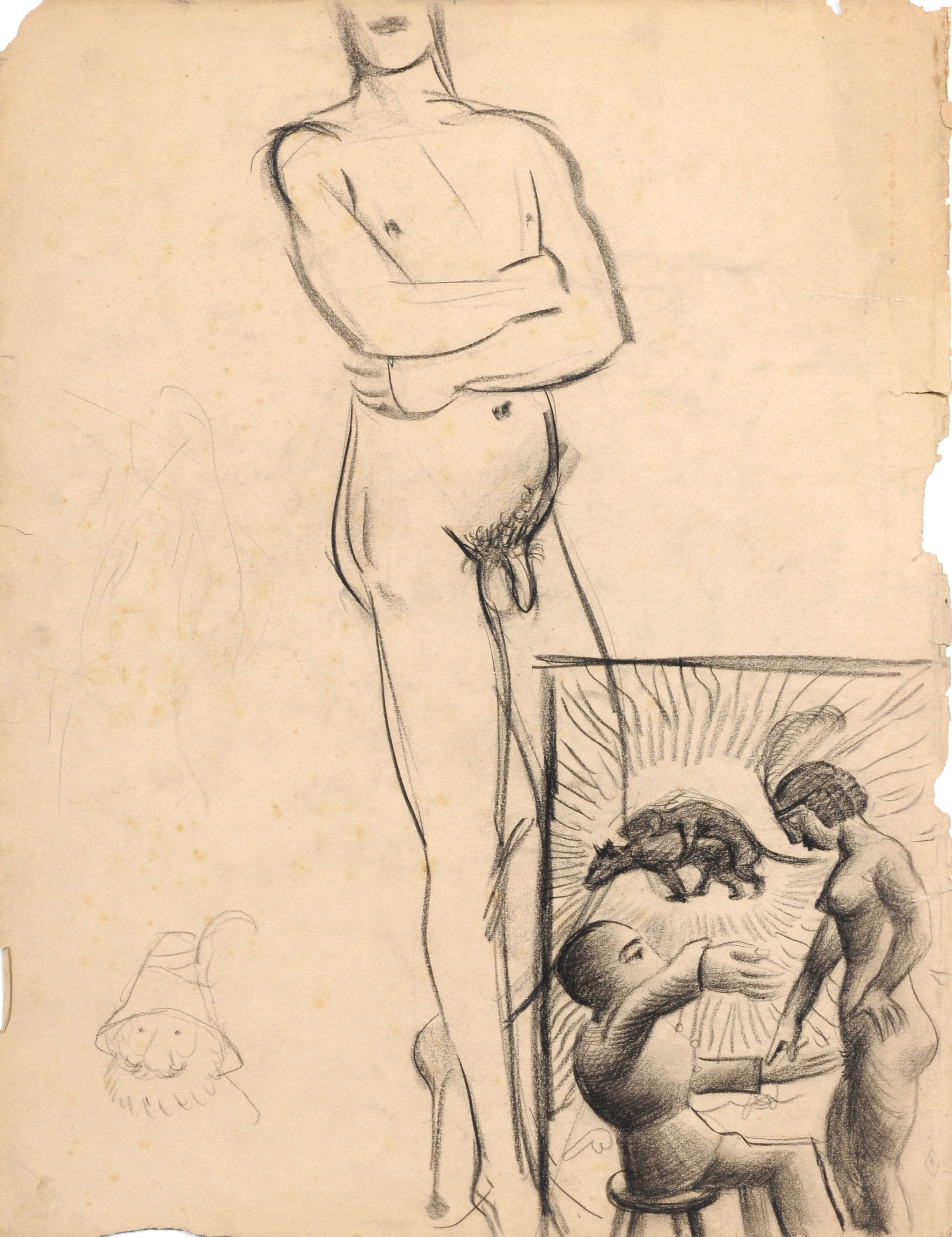 Kohlezeichnungen und Blei. Unsigniert. Ein Blatt innerhalb der Darstellung betitelt. Beide Zeichnungen verso mit Studien eines männlichen Aktes, dort auch jeweils mit dem Nachlass-Stempel versehen.