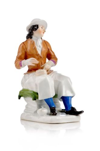 Porzellan, glasiert und in polychromen Aufglasurfarben staffiert. Auf einem Steinsockel mit Kissen sitzender Bauer, ein Tabaksäckchen auf dem rechten Bein. Unterseits der flachen, naturalistischen Plinthe die schwach lesbare Schwertermarke auf unglasiertem Boden, wohl eingepresste Beizeichen, eine spätere Bezifferung "52" in Blei.
