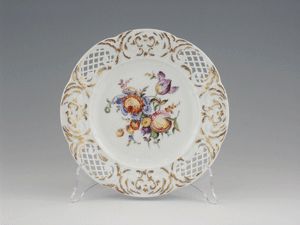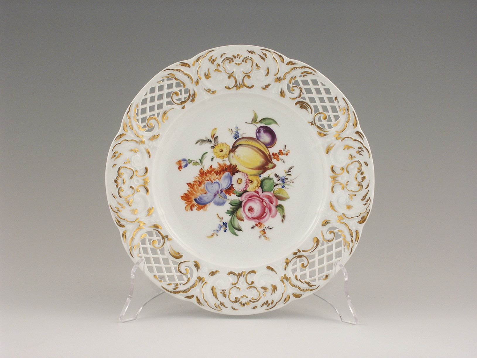 Spiegel mit Blumenbouquet und Früchten in Aufglasurmalerei, mit durchbrochenem Rand, welcher durch 4 Kartuschen unterteilt wird. Goldstaffage. Marke unterglasurblau, Präge- u. Malerzeichen.