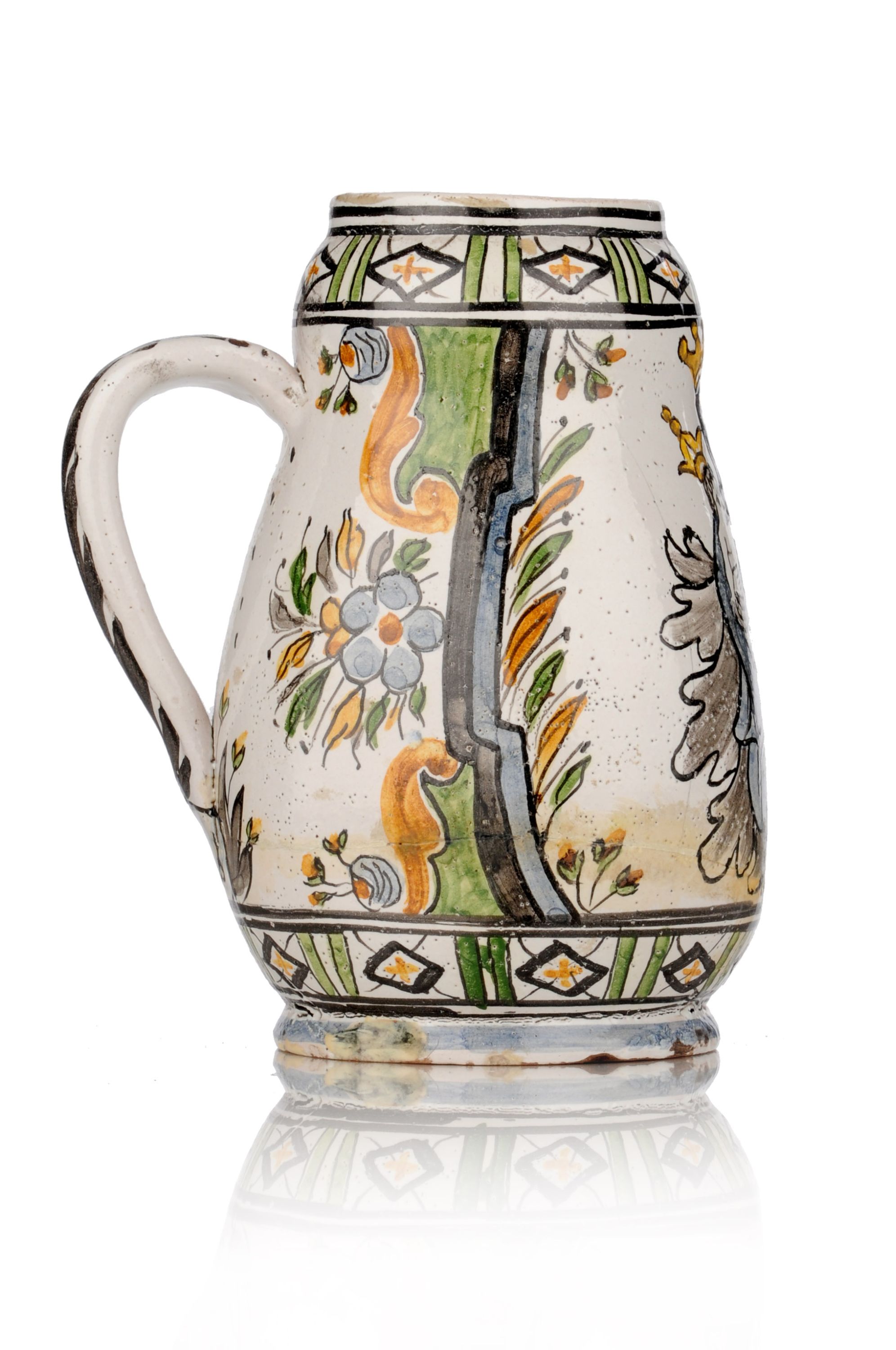 Fayence, rötlicher Scherben, glasiert und mit Scharffeuerfarben staffiert. Gebauchte, dreiseitig abgeflachte Form über kurzem Stand. Zur leicht eingezogenen Mündung nodusförmig, dreifach profilierter Bandhenkel. Zentral eine Kartusche mit dem Motiv der Marienverehrung. Maria und Jesus bekrönt und auf einer Wolke thronend, flankierend florale Elemente, oberhalb und unterhalb jeweils ein Fries mit Rautenmotiv. Verso unterhalb des Henkels in Schwarz datiert "1766". Ungemarkt.