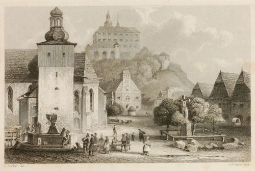 Stahlstiche (4) und eine Radierung. Alle Blätter in der Platte typographisch bezeichnet u.re. und u.li., sowie betitelt u.Mi. Die Stahlstiche aus: "Wanderungen durch das Riesengebirge und die Grafschaft Glatz", Verlag Georg Wigand, Leipzig. An den Ecken auf Untersatzpapier montiert.