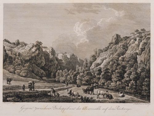 Kupferstiche nach J. Ch. Klengel, J. F. L. Oeser und nach eigener Erfindung. Aus der Folge von 16 Kupferstichen zu W. G. Beckers "Der Plauische Grund bei Dresden" von 1799, erster Band. Jeweils unterhalb der Darstellung re. in der Platte signiert "J.A.Darnstedt sc.", li. Angabe des entwerfenden Künstlers, u.Mi. betitelt. Verso von unbekannter Hand in Blei bezeichnet.