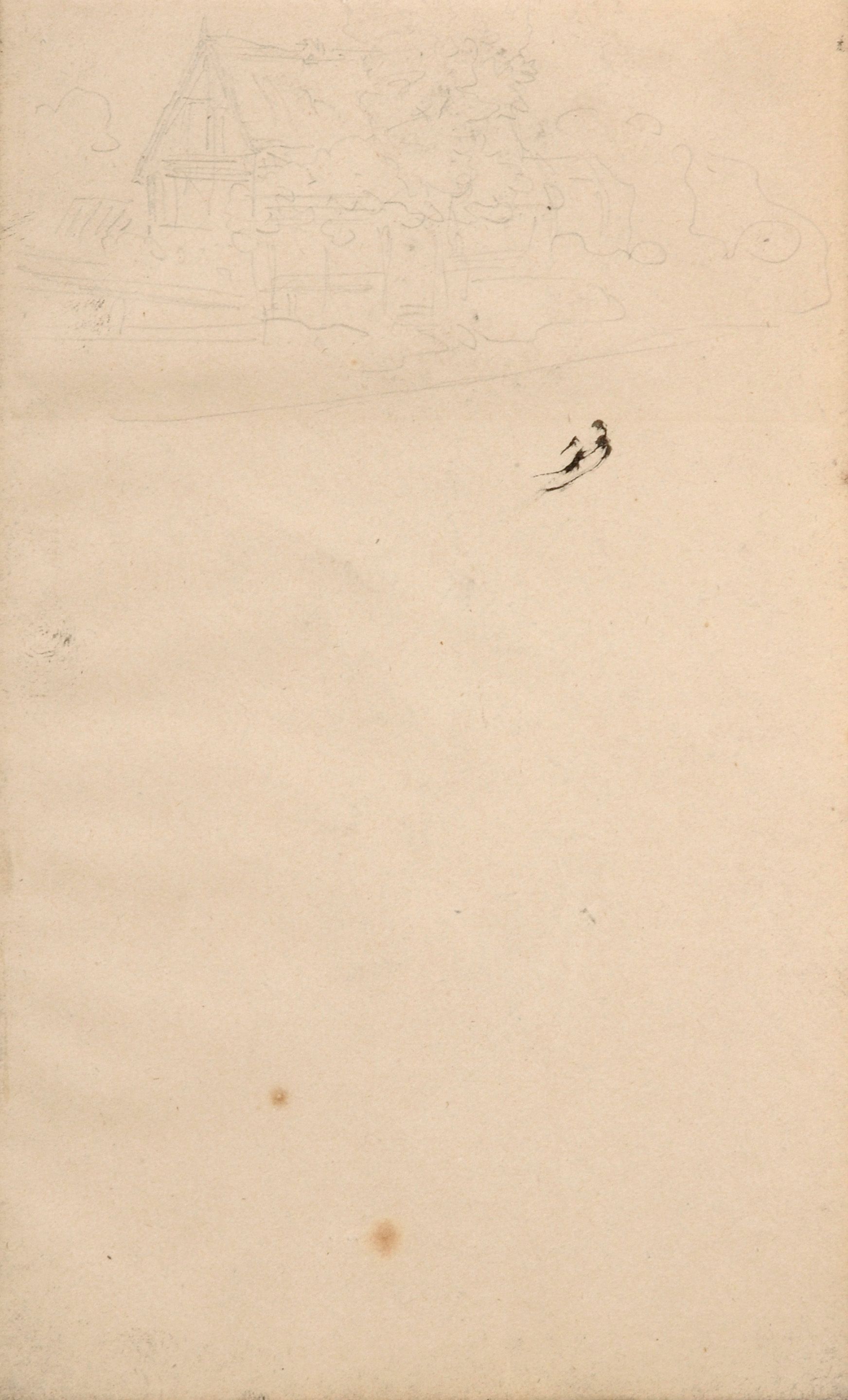 Ingesamt altersbedingt gegilbt. "Bauernhaus" mit zwei bräunlichen Flecken.
