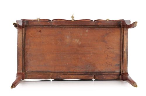 Laubholz, funiert und lackpoliert sowie mit partiell schattierter Marketerie. Dreigeteilte, bandverbundene Deckplatte mit geschweiften Zargen über geschwungenen Beinen. Dreigeteilte Front, zentral ein Schub sowie ein ausziehbares Tablett, flankierend auf einer Seite ein Blindschub, auf der gegenüberliegenden ein flacher Schub. Die Innenfelder der Deckplatten sowie der Front mit einem intarsierten, von geometrischer Bandmarketerie umrahmten, Floraldekor. Verso ein intarsiertes Rankendekor. Beine mit Messingapplikationen. Auf der Unterseite der mittleren Deckplatte ein verschiebbarer Spiegel, die flankierenden Deckplatten nach außen aufzuklappen. Unterseits mit einer gestempelten Herstellermarke sowie in Schwarz beziffert "8740".