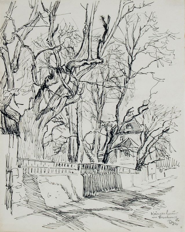 Federzeichnungen in Tusche und zwei Graphitzeichnungen. Drei Blätter in Blei signiert "Burkhardt-Untermhaus" und ausführlich betitelt u.re. Ein Blatt in Tusche ausführlich betitelt und datiert u.re.