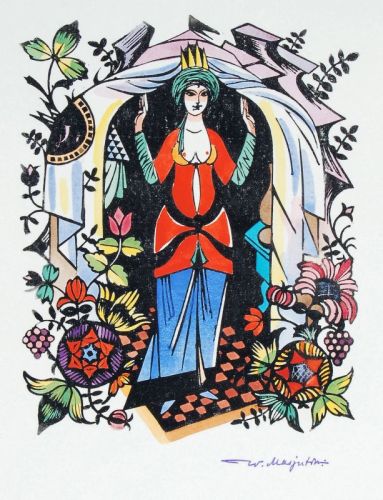 Kolorierte Holzschnitte auf Bütten. Alle 15 Blätter in Faserstift u.re. signiert "W. Masjutin". Spätere, handkolorierte, Künstlerdrucke von den Originalstöcken aus den 1950er Jahren. Das Deckblatt fehlt, dafür enthält dieses Konvolut ein nicht im WVZ Werner aufgeführtes Blatt mit der Darstellung des Zaren Dadon, des Protagonisten des Märchens.
