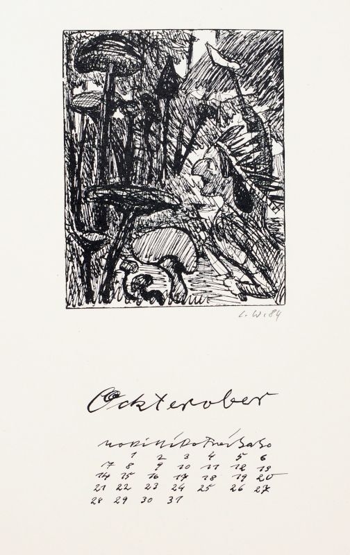 Lithografien auf hellem Karton. Kalender mit insgesamt 14 Blättern, inklusive Deckblatt und Zusatzmonat "Zweezember". Auf dem Deckblatt in Blei signiert "Weidensdorfer" und datiert u.re. U.li. mit Nummerierung versehen "63/150". Die einzelnen Kalenderblätter jeweils unterhalb der Darstellung re. in Blei monogrammiert "C.W." und datiert.