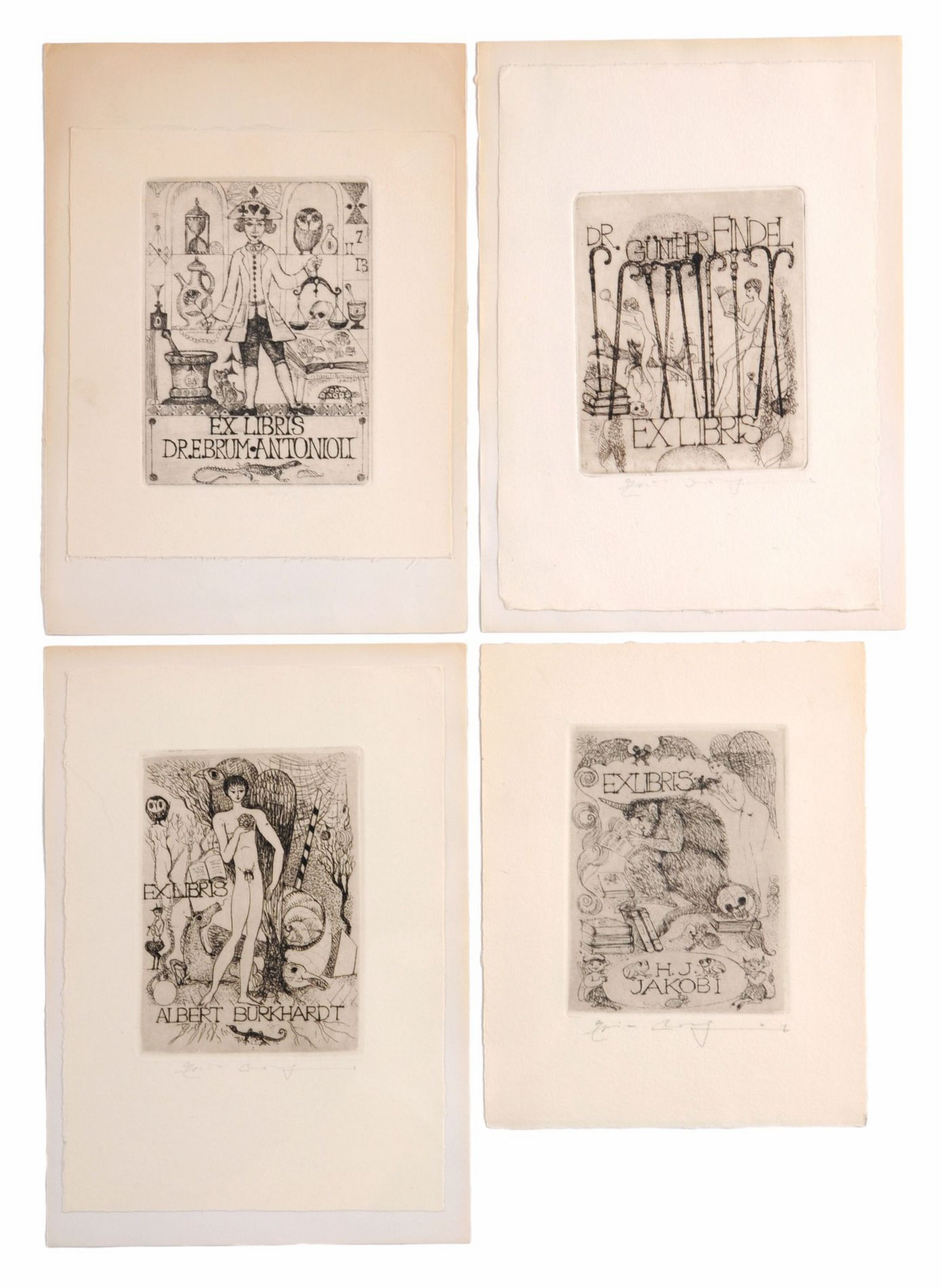 Verschiedene Drucktechniken. Mit ca. 300–500 Exlibris, darunter einige Jugendstil-Exlibris. U.a. mit Arbeiten von Elfriede Weidenhaus, Kornél Révész, Jaroslav Vodrazka, Karl Rogg.