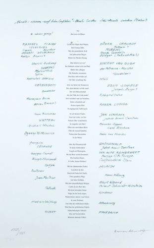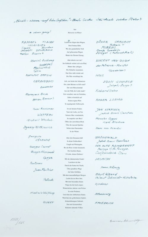 Verschiedene Techniken auf verschiedenen Trägermaterialien. Mappe mit 30 Arbeiten, u.a. von Wieland Förster, Eberhard Göschel, Gotthard Graubner, Peter Herrmann, Gerda Lepke, Walter Libuda, Ulrich Lindner, Thea Richter, Strawalde, Max Uhlig. Jedes der Blätter in Blei signiert und nummeriert. Graphik-Edition in 50 Exemplaren, davon 20 Verkaufs- und 30 Autorenexemplare. Hrsg. von Prof. Dr. h.c. Werner Schmidt im Auftrag der Sächsischen Akademie der Künste, Dresden. Exemplar XXIX / XXX. In der originalen Halbleinen-Mappe.