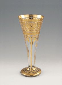 Farbloses Glas, Wandung mit floralem Dekor in Gold, mit Reliefemailkonturen in Weiß und Bordeaux versehen. Trompetenform, weit ausgestellte Mündung, zum Stand flach ausgestellt. Golddekor min. berieben.