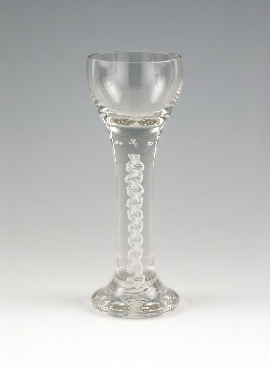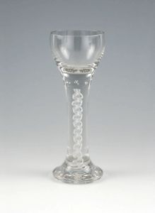 Farbloses Glas. Relativ kurze, weit geöffnete Kuppa auf einem langen Schaft mit eingeschmolzenem Filigranglas-Stab und sechs kranzförmig eingestochene Luftblasen.