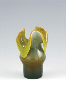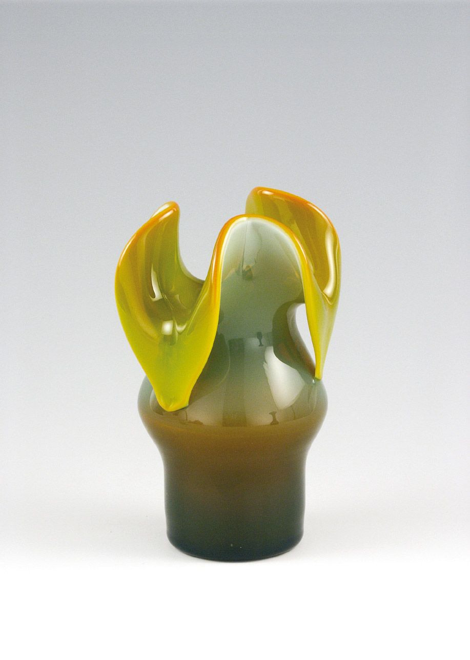 Grünlich-gelborange-opakes Glas, hellgrauopak überfangen. Zylindrische Form mit gebauchter Wandung, Mündung dreimal zipfelartig ausgezogen und umgebogen.