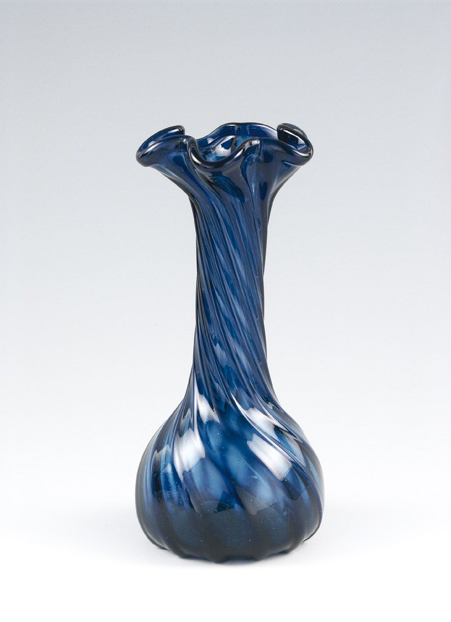 Blauopakes Glas. Bauchige Form mit langem zylindrischen Hals. Mündung fünffach wellig gekniffen.