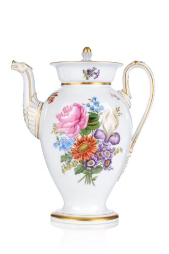 Porzellan, glasiert und in polychromen Aufglasurfarben staffiert. Aus dem Service "Schlangenhenkel" (T-Form). Balusterförmiger Korpus, mit hochgezogenem Henkel sowie einem Ausguss in Schlangenkopfform. Der Knauf des Deckels in Form eines stilisierten Zapfens. Ausguss und Henkel mit einem stilisierten Reliefdekor. Auf der Wandung zwei üppige Blütenbuketts mit Rose, Schwertlilie, Tulpe und Federmohn, flankiert von gestreuten Blütenzweigen. Die Ränder mit breitem Goldfaden. Unterseits die zweifach geschliffenen Knaufschwerter sowie zwei Prägeziffern.