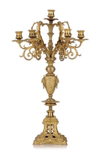 Gelbguss, vergoldet. Siebenflammig. Mehrteilig, geschraubt. Siebenflammig. Profilierter Balusterschaft mit antikisierendem Frauenrelief alternierend mit Löwenringen über einem durchbrochen gearbeiteten Postament mit vier Delphinfüßen. Schaft und Fuß mit einem üppig reliefierten Palmetten-, Zungen- und Kugelfriesdekor. Vom Schaft ausgehend ein vertikal trichterförmig aufstrebender sowie sechs S-förmig geschwungene Arme mit reliefiertem Blattwerkdekor und je einer vasenförmigen Tülle über einer rosettenförmigen Tropfschale. Ungemarkt.